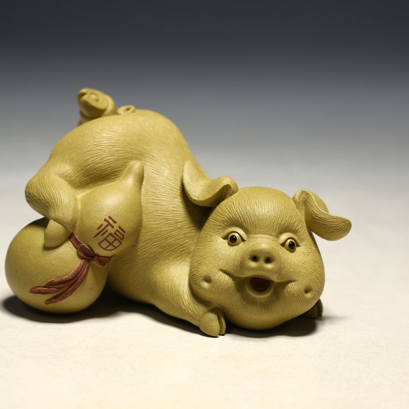 明理茶艺 宜兴摆件紫砂茶宠(朱亚军手工雕塑福禄小猪)茶玩